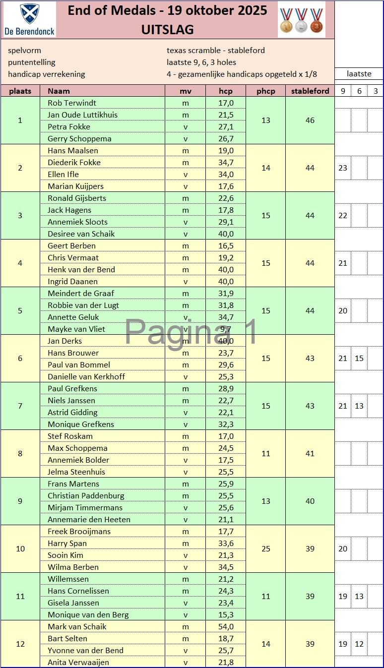 Nieuws, UitslagenZondag 19 oktober hebben 48 deelnemers de End of Medals onder prima weers- en baanomstandigheden gespeeld. Met een Texas Scramble werd het seizoen van de Wedstrijdcommissie (WC) afgesloten.