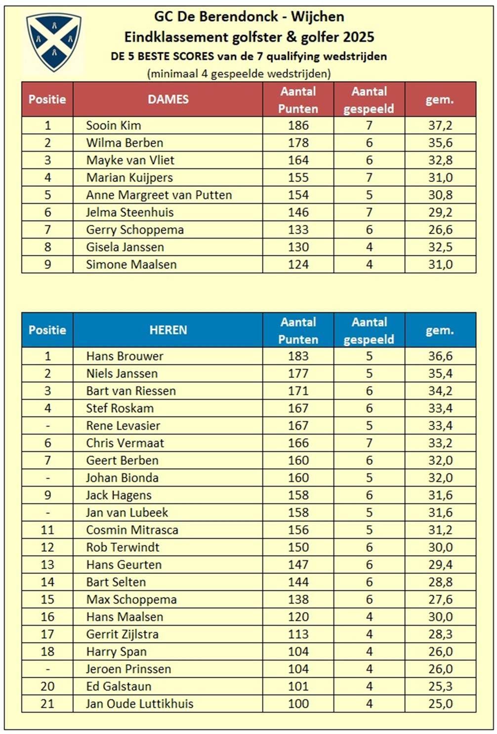 Gemiddeld was de deelname in 2025 bij de heren 21,0 t.o.v. 19,1 in 2024 (+10%). Bij de dames ook een lichte toename naar 9,6 t.o.v. 9,0 (+6%). De gemiddelde score was zowel bij de dames als heren 29,5 – vrijwel gelijk aan 2024!