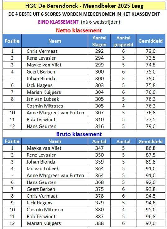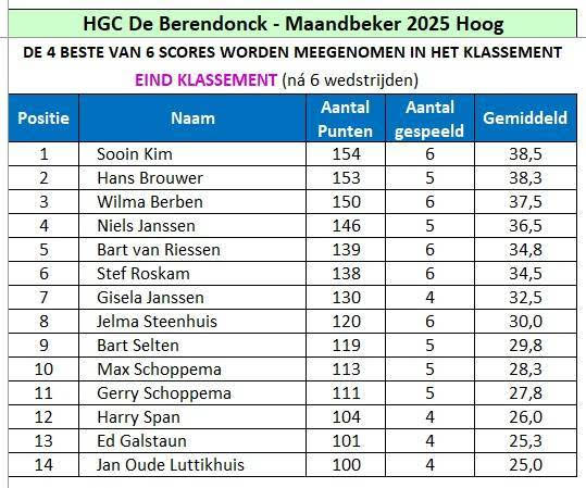 Volgend jaar zijn er 7 maandbekers en zullen de best 5 scores meetellen voor het klassement.