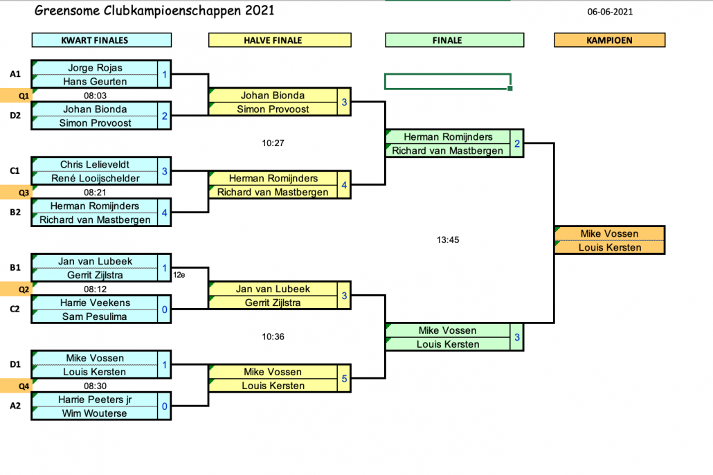 Na vele spannende poule-wedstrijden zijn de kwartfinalisten bekend van het Greensome Kampioenschap 2021. Hieronder de uitslagen en de indeling van de kwartfinales.