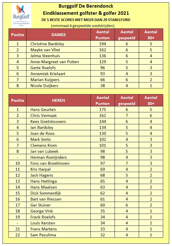 Het eindklassement werd hierdoor bepaald door de beste 5 scores van 6 wedstrijden, verspreid over het hele jaar. Zoals gebruikelijk worden alleen scores vanaf 30 stablefordpunten meegeteld.