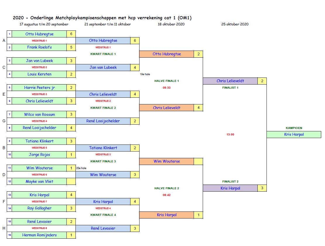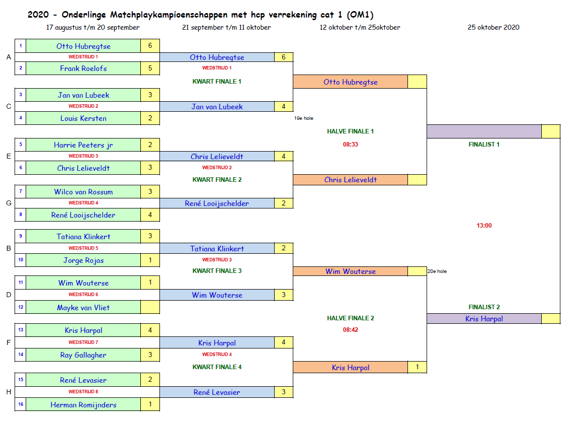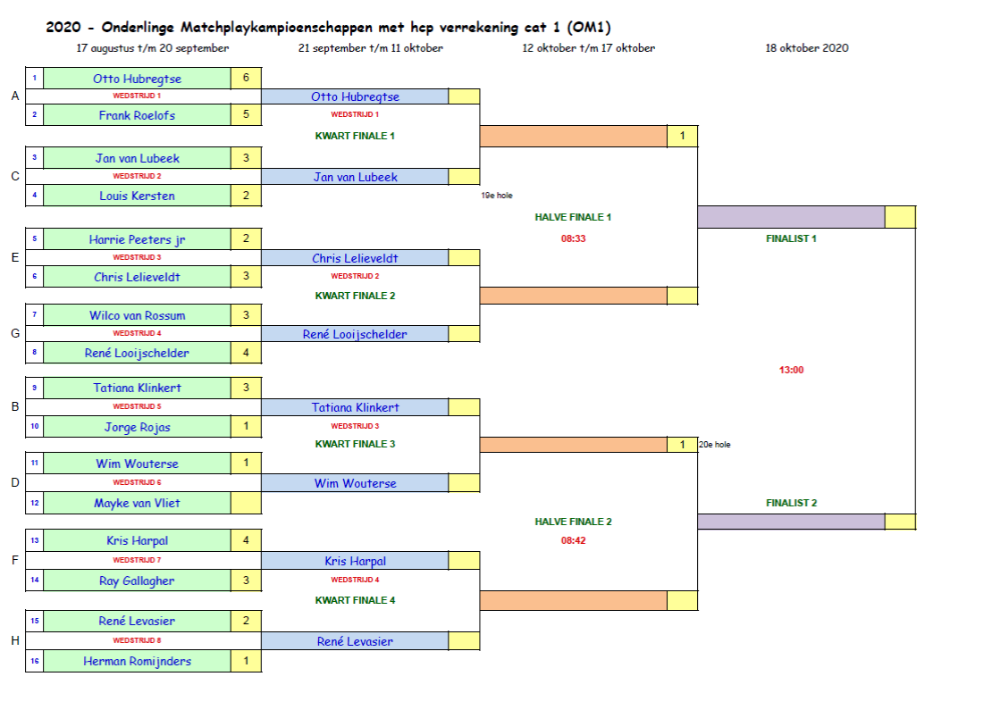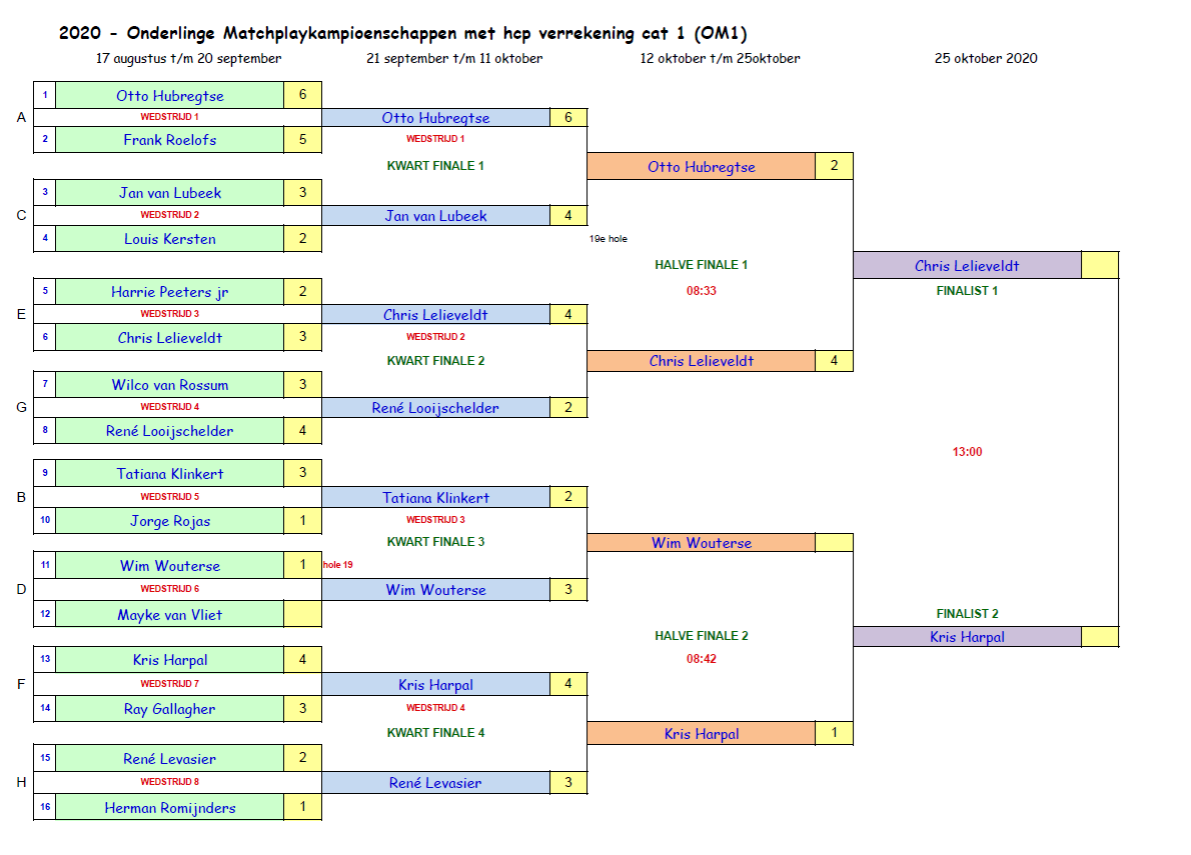 In de halve finales won Kees Goetstouwers met 1/0 van Hans Hettinga en in de andere halve finale won Donald Cortbett ook met 1/0 van Herman Romijnders. Hiermee bereikte Donald zijn 2e finale. Zijn 1x was in die bewuste koude & regenachtige dag in 2017 en toen verloor hij van Coen Martens op hole 14.