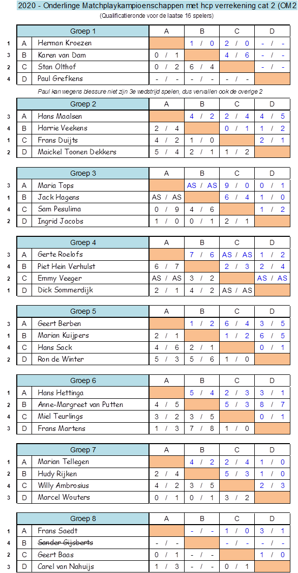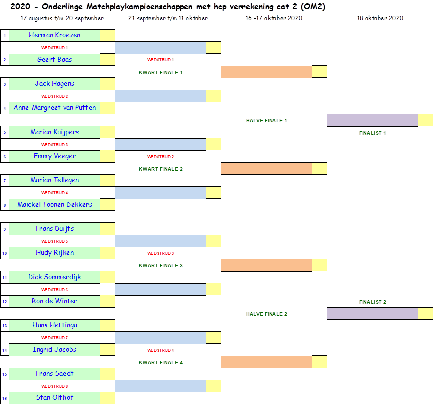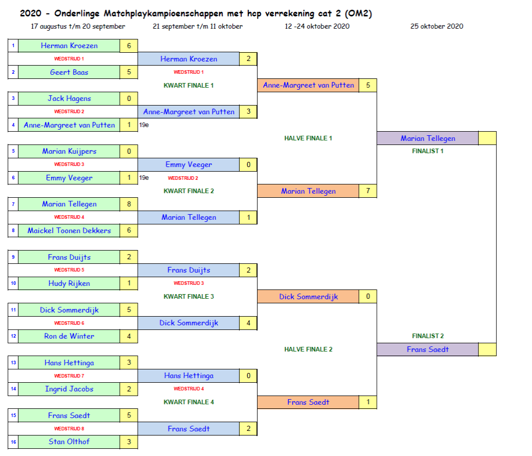 In de halve finales won Kees Goetstouwers met 1/0 van Hans Hettinga en in de andere halve finale won Donald Cortbett ook met 1/0 van Herman Romijnders. Hiermee bereikte Donald zijn 2e finale. Zijn 1x was in die bewuste koude & regenachtige dag in 2017 en toen verloor hij van Coen Martens op hole 14.