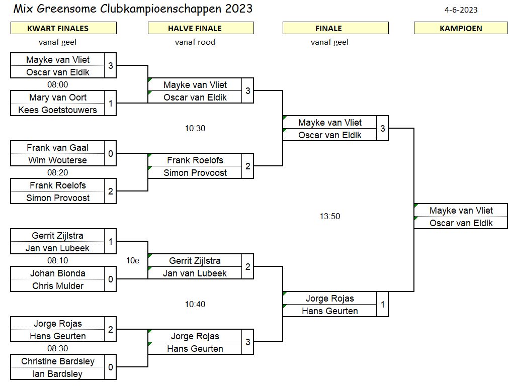 De finale partij tussen Kris en Hans was vanaf het begin in het voordeel van Kris die weinig fouten maakte en met een sterk kort spel rondom de greens. Op hole 14 bracht Hans de achterstand terug naar 1 maar op hole 15 sloeg hij zijn afslag te aanvallend in de bunker – 2 up voor Kris. Hole 16 slaat Hans zijn 2e slag met een slice i.p.v. een fade richting de sloot. Kris met 2 op de green op 3,9m van de vlag. Bal van Hans nog net voor de sloot en chip naar vlag blijft op 1m liggen. Kris maakt Par met 2 putts en de wedstrijd is dormi. Op hole 17 maken beiden een bogey en is Kris met 2/1 de terechte winnaar.