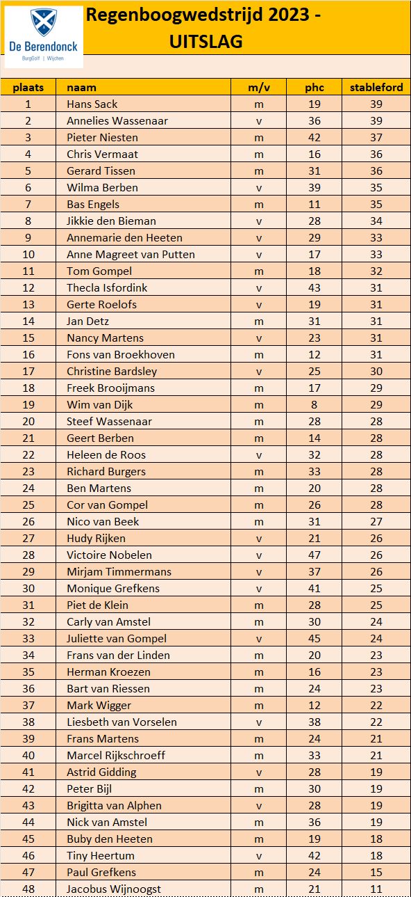 Op zondag 21 mei hebben 54 deelnemers tijdens een mooi zonnige dag de Regenboogwedstrijd gespeeld. Iedereen moest op elke hole een keuze maken van welke teebox gespeeld zou worden. Over de 18 holes 3x wit, 4x geel, 4x blauw, 4x rood en 3x oranje met als restrictie dat op de parren 3 niet van wit afgeslagen mocht worden.
