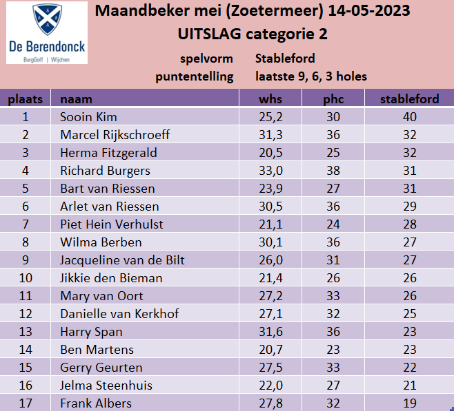 De winnaar van de nearest werd Geert Berben. Bij de chips in het net waren 4 flights met een score van 2 ballen in het net. De flight met de hoogste gezamenlijke handicap werd tot winnaar uitgeroepen: Tiny van Heertum, Mirjam Timmermans en Freek Brooijmans.