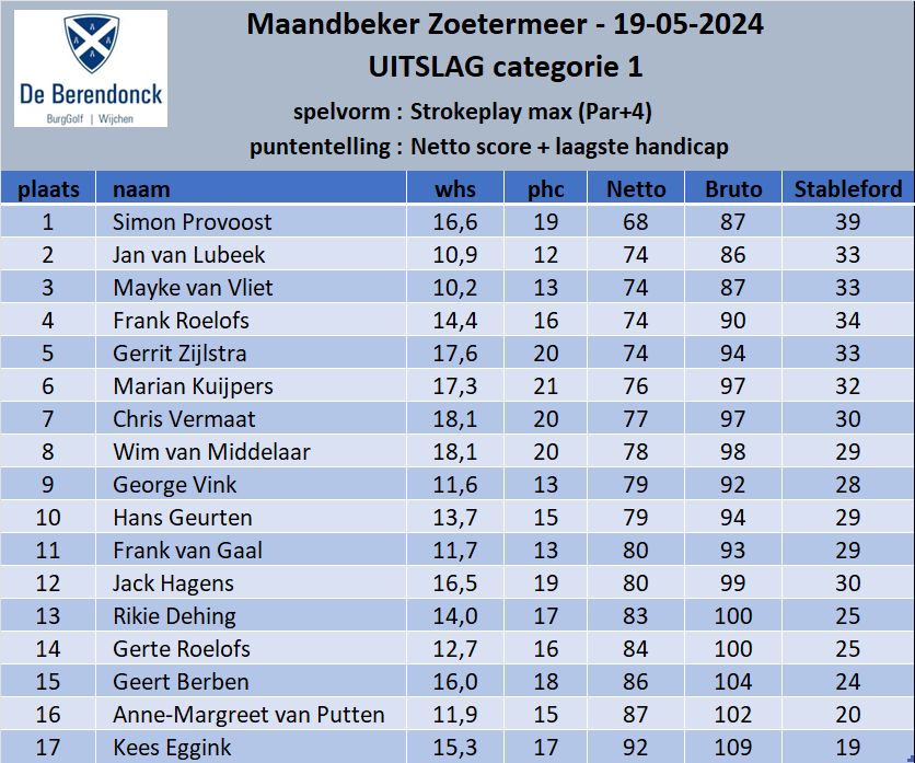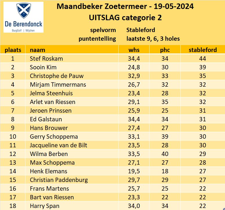 In categorie 2 scoorde Sooin Kim een mooie 39 punten, maar Stef Roskam werd overtuigend de winnaar met een ongelofelijke 44 punten. In categorie 1 waren er maar liefst vier golfers met 74 slagen. Op basis van de playing handicap werd Jan van Lubeek tweede. Simon Provoost won de Zoetermeer (wissel)beker met 68 slagen. Als eersten mochten ze allebei de golfhanddoek van de wedstrijdcomissie als prijs in ontvangst nemen.