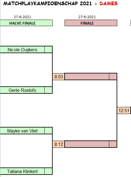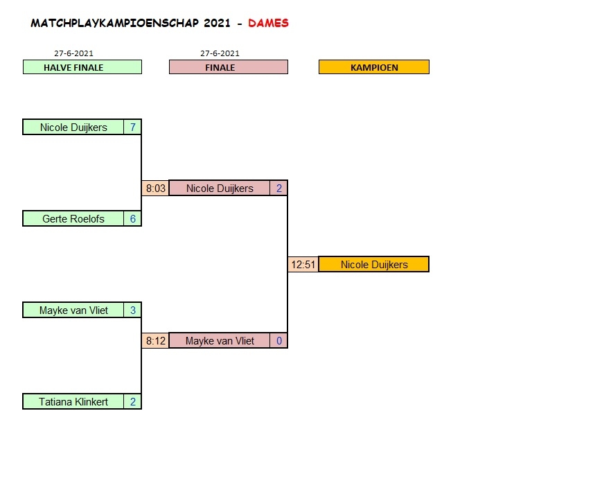 De finale tussen Nicole en Mayke was lange tijd in evenwicht en altijd spannend. Na hole 17 stond Nicole 1 up en was er maar een opdracht voor Mayke: hole 18 winnen voor een play-off. Dit lukte haar echter niet en hierdoor werd Nicole met 2/0 de kampioene 2021 (haar 2e titel na die van 2019).