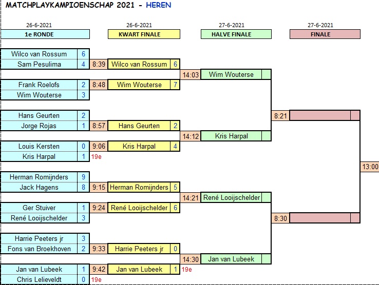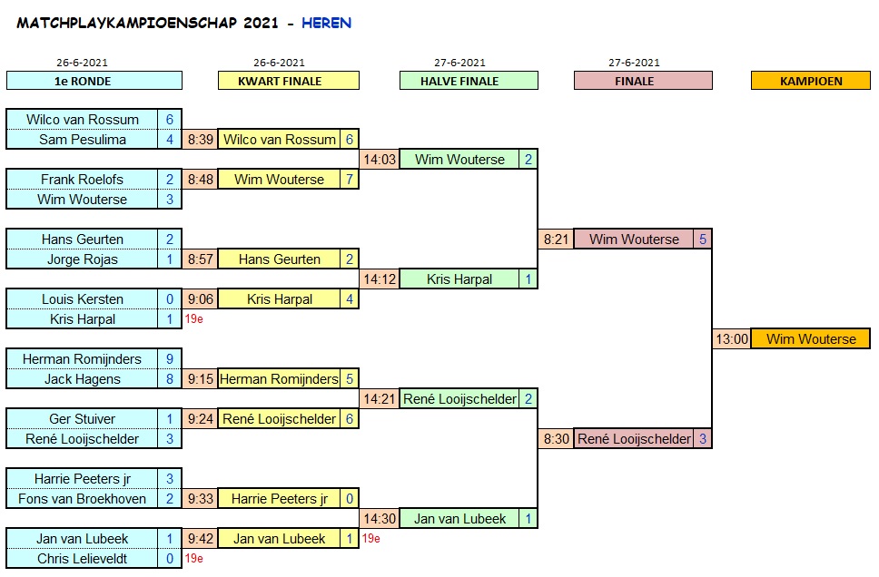Matchplay CK, Nieuws, UitslagenOp zaterdag 26 juni werden door de Heren de achtste- en kwartfinales gespeeld van de Matchplay Kampioenschappen 2021.
